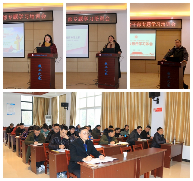 为深入学习贯彻习近平总书记在全国教育大会上的重要讲话精神和中国工会十七大精神,提高工会干部政治理论素质和实际履职能力,切实加强工会干部队伍建设,助力学校发展,12月21日及27日下午,校工会在教工之家多功能活动厅举办了2018年工会干部学习培训班三场专题报告会,院党委副书记刘艺、安徽师范大学工会主席赵红及安徽工程大学工会主席王河应邀分别作了题为《培养德智体美劳全面发展的社会主义建设者和接班人——学习贯彻习近平总书记在全国教育大会上的重要讲话精神解读》、《凝聚发展共识建设和谐之家---新时代高校工会工作实践与探索》及《落实中国工会十七大精神 唱响新时代奋斗者之歌——十七大报告学习体会》,院教代会执委会委员、工会委员会委员、经审委员会委员、女工委员会委员及各分工会委员、工会全体工作人员等参加会议。培训报告会由院工会主席宁勇敏主持。